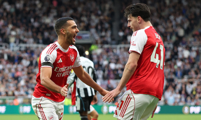 Mikel Merino och Declan Rice firar 1-1-målet mot Newcastle United.