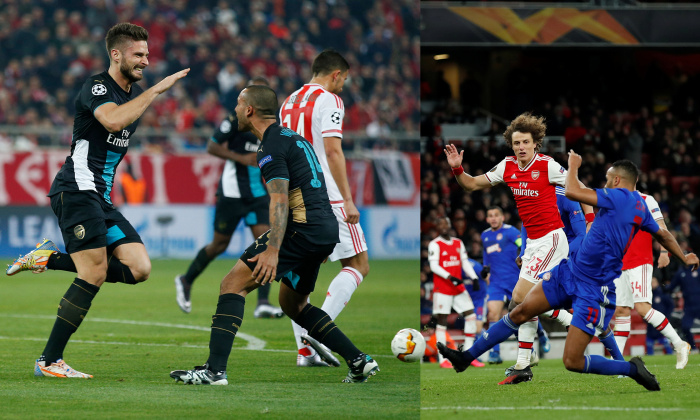 Giroud gjorde hattrick mot Olympiakos 2015, men David Luiz glömde bort Youssef El-Arabi 2020.